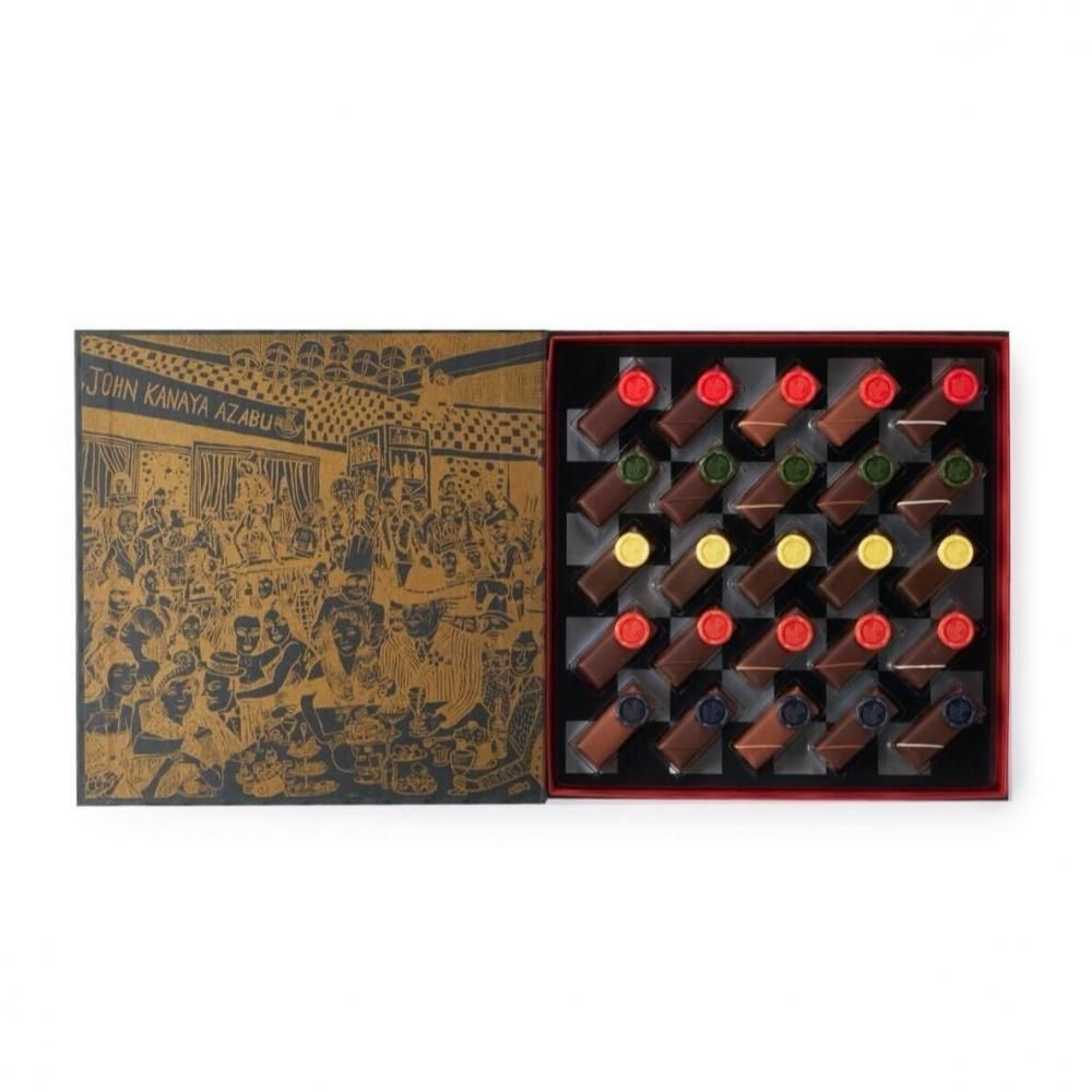 男性の小物をイメージした箱の中には21種25個のボンボンショコラが豪華に並んでいます。